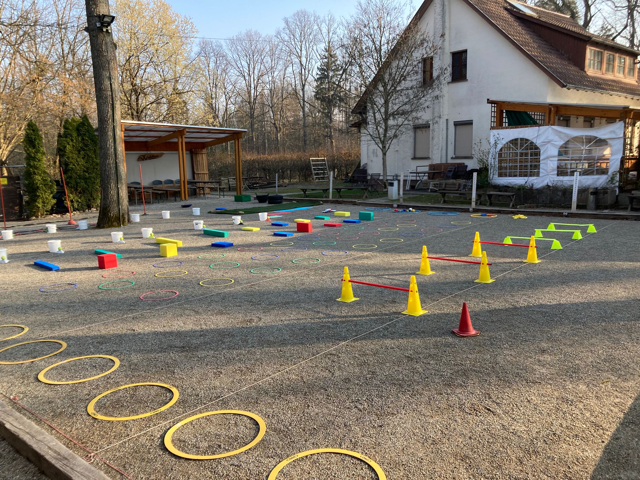 Begrüßt wurden die Teilnehmenden von einer bunten Auswahl an möglichen Übungsstationen auf dem gesamten Gelände des Waldheimvereins Backnang. Hütchen, Stangen, Eimer, Reifen, Tennisbälle, Reifen, Kisten uvm. waren auf den Bahnen verteilt, um aufzuzeigen, dass man mit etwas Kreativität spannende und lustige Aufgaben an die Kinder und Jugendlichen stellen kann.