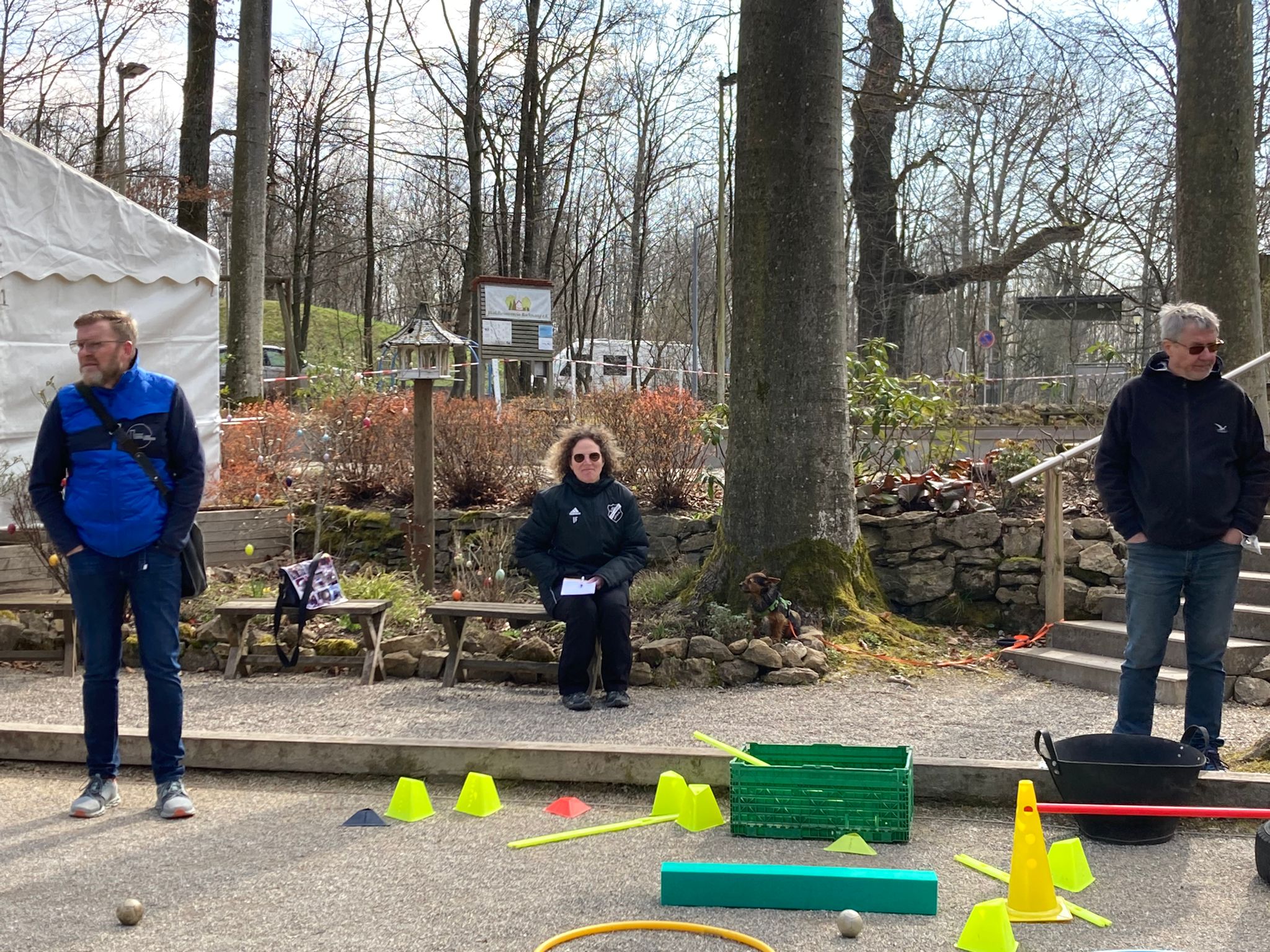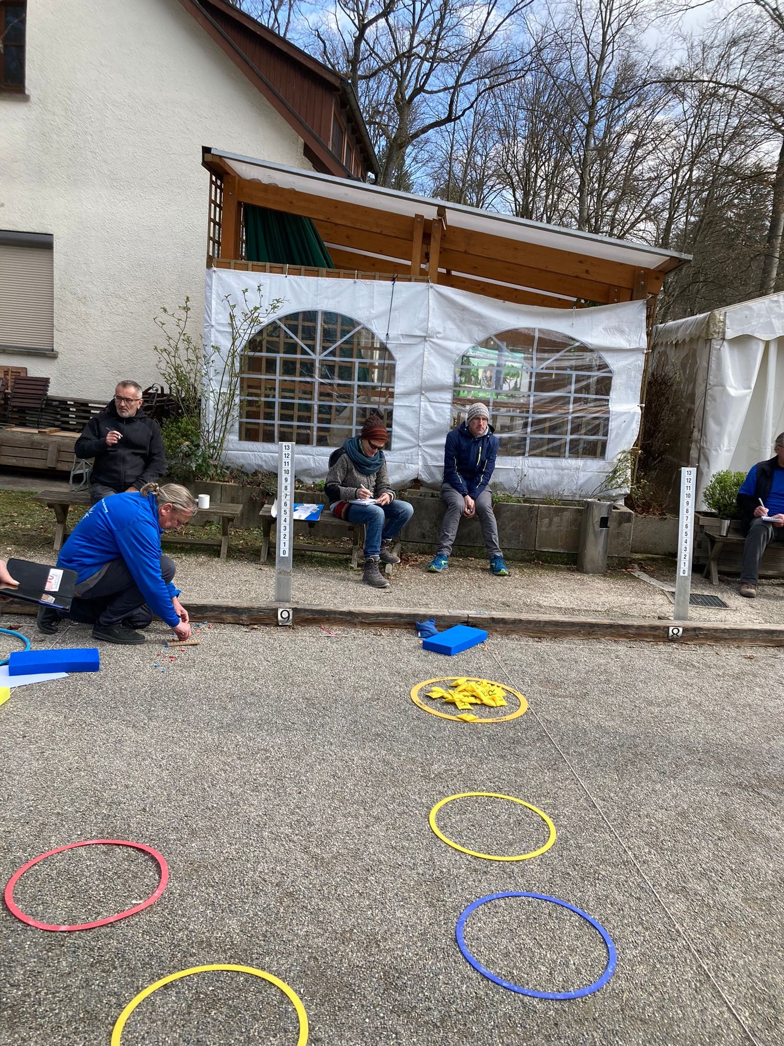 Im Anschluss traf man sich nach einer Kaffeepause mit selbstgebackenem Kuchen (Danke an die Gastfreundschaft nach Backnang) auf den Spielfeldern, um alle aufgebauten Trainingsstationen zu begutachten, auszuprobieren und auch mal ein Gefühl für die kleineren Kugeln bzw. Indoor-Kugeln zu bekommen. Schnell stellten die Spielerinnen und Spieler fest, dass die geringeren Distanzen für Erwachsene gar nicht so einfach zu bewältigen waren, Kugeln gingen gerne mal zu weit oder daneben.